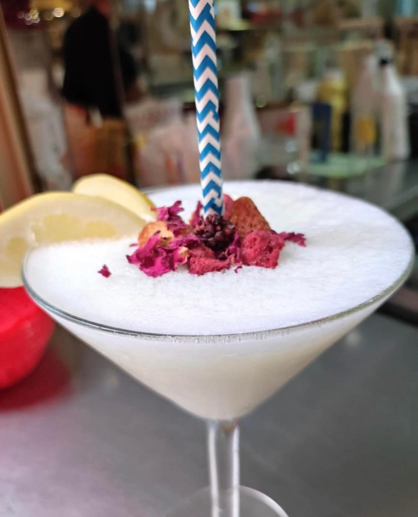 Helado de fresa, limón granizado, y ron blanco.